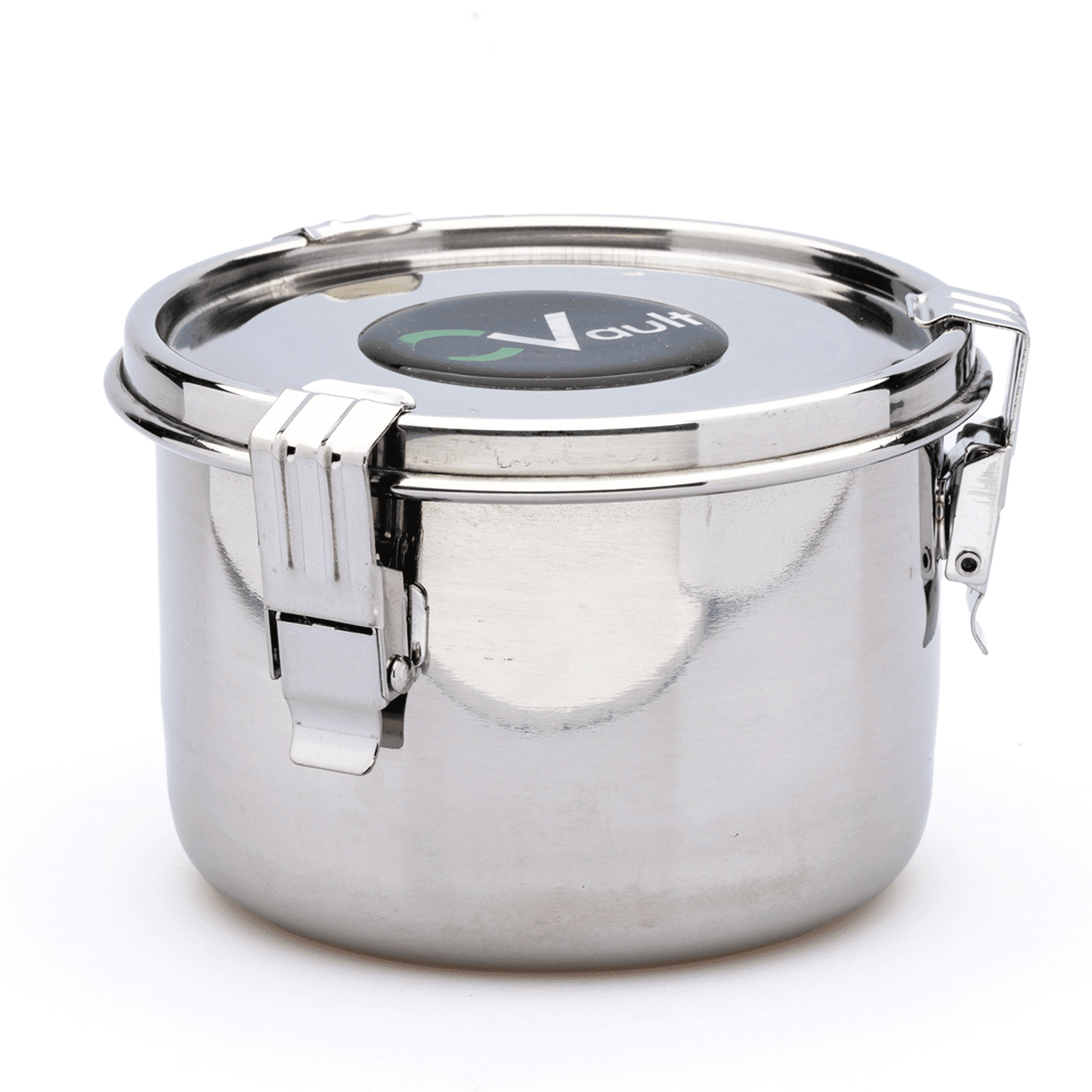 A CVault is a specially engineered container for storing flower in ideal conditions. Made from 304 food-grade stainless steel, it features an airtight seal and includes a Boveda humidity pack, which automatically balances the humidity inside the container. This keeps your flower from drying out or becoming too moist, helping preserve freshness and quality without any maintenance.