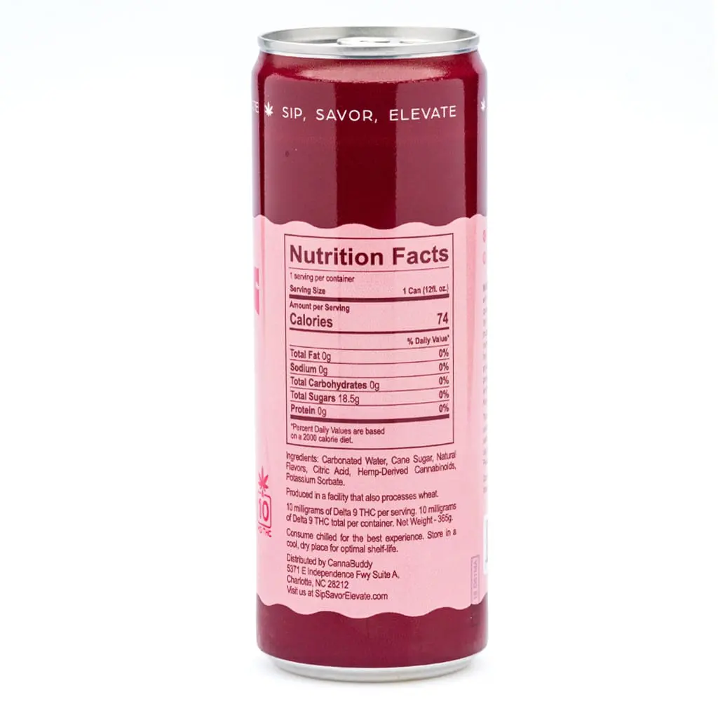 Carbonated Water, Cane Sugar, Natural Flavors, Citric Acid, Hemp-Derived Cannabinoids, Potassium Sorbate.