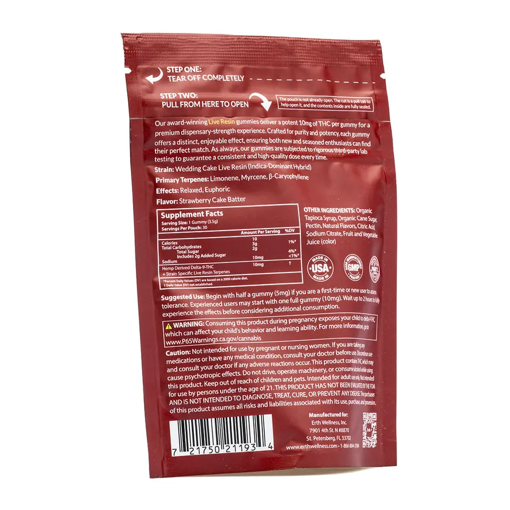 Get cozy with Erth Wellness THCLive Resin Gummies – Wedding Cake, a flavorful edible that brings full-body ease and mellow mood elevation in every bite. Each 30-count bag delivers 10 milligrams of Delta 9 THC per gummy, paired with live resin from flash-frozen Wedding Cake flower to maintain the strain’s signature sweetness and relaxing effect profile.