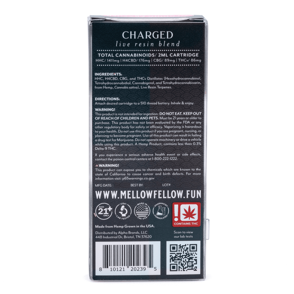 Mellow Fellow pharmacist-formulated this unique proprietary blend of cannabinoids to create a one-of-a-kind experience that motivates and invigorates. In the Charged Blend Live Resin Vape Cartridge – Wedding Crasher, they brought together H4CBD, TCHV, HHC, and CBG to create an entourage effect that uplifts and gets you just the right amount of energy – no matter what the occasion.