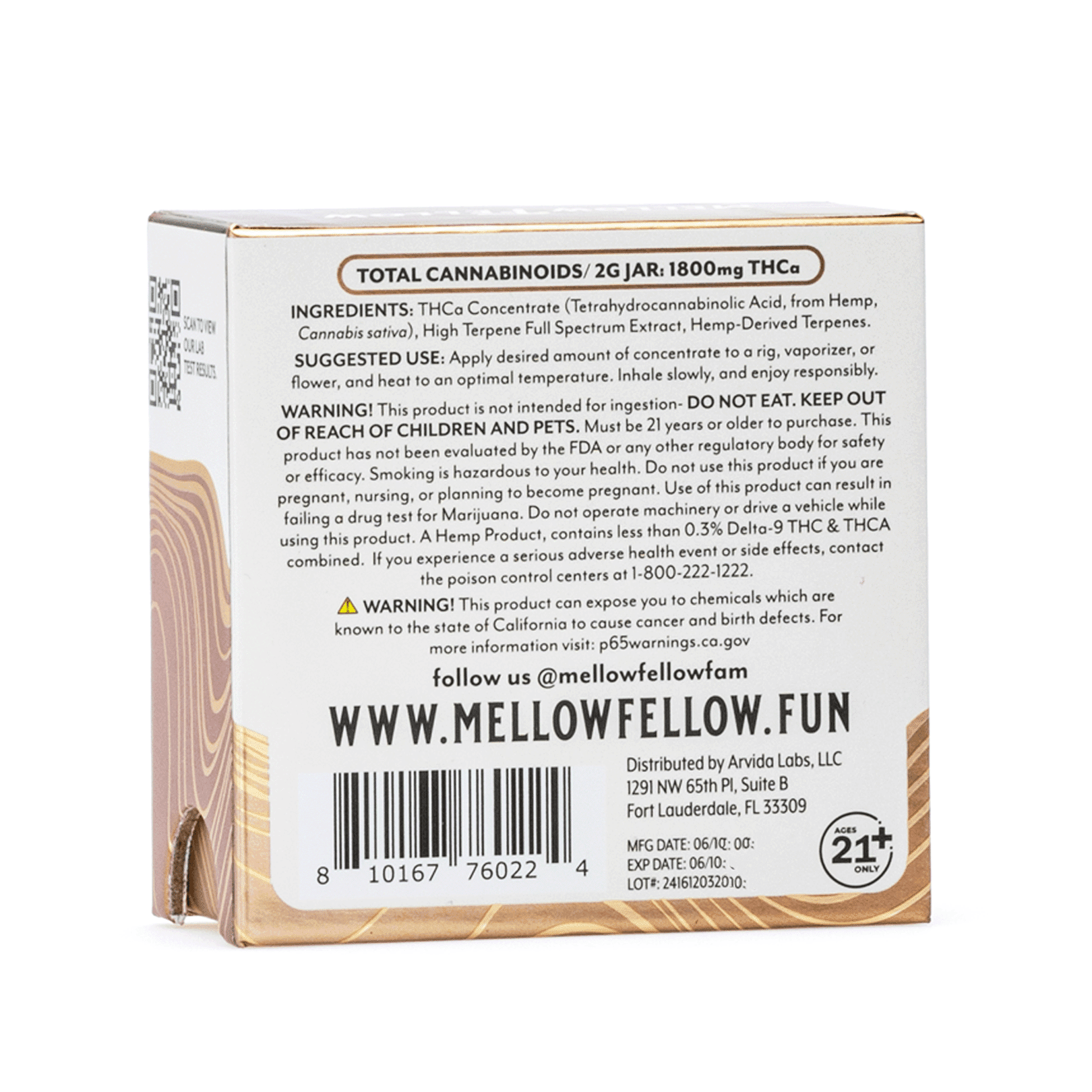 CannaBuddy partners with top industry experts to provide the highest quality THCa budder on the market. Each product undergoes rigorous third-party testing to guarantee consistency, potency, and exceptional quality. After adding Mellow Fellow THCa Budder to the cart, explore the rest of our complete curated collection of premium cannabis products.