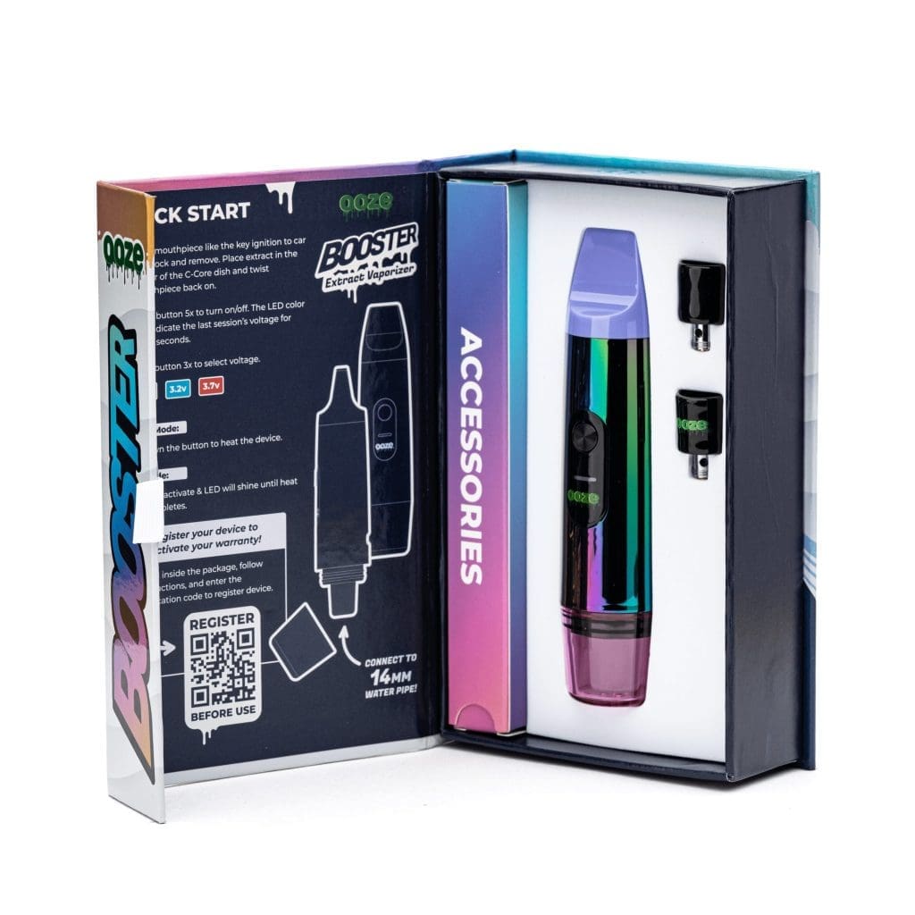 The Ooze Booster Extract Vaporizer lets you enjoy the power of dabs without any hassle or bulky equipment. You can use this sleek rainbow color vape to dab cannabis concentrates, extracts, and oils. The enclosed adapter can be inserted into a water pipe, creating a torchless dab rig. The vaporizer’s C-Core Onyx Atomizer allows for easy airflow, amazing flavor, potent dabs, and a 100% heavy-metal-free vape sesh. The extract vape heats up super fast and has three different voltage settings, allowing you to customize your dabbing journey and taste the full terpene profile of your cannabis.