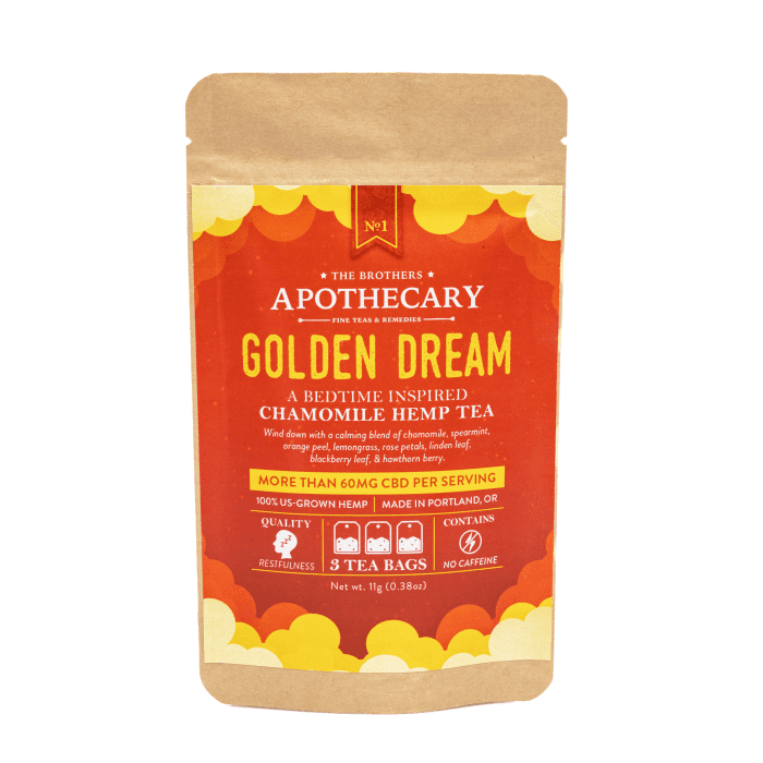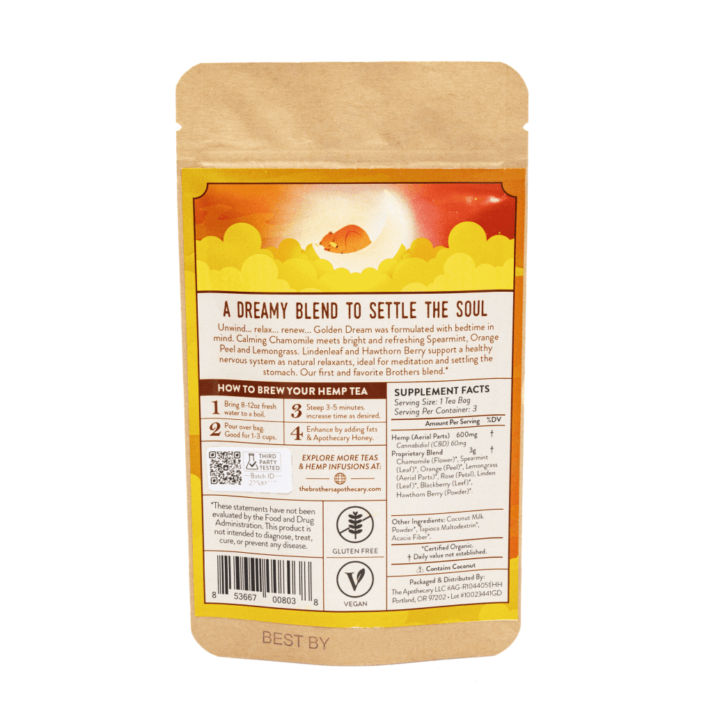 Unwind… relax… renew… Golden Dream CBD Chamomile Tea was formulated with bedtime in mind. Calming Chamomile meets bright and refreshing Spearmint, Orange Peel and Lemongrass. Each package contains: 3 tea bags, 60 MG Full Spectrum CBD per tea bag, no caffeine, coconut milk (used as a lipid to increase CBD absorption)
