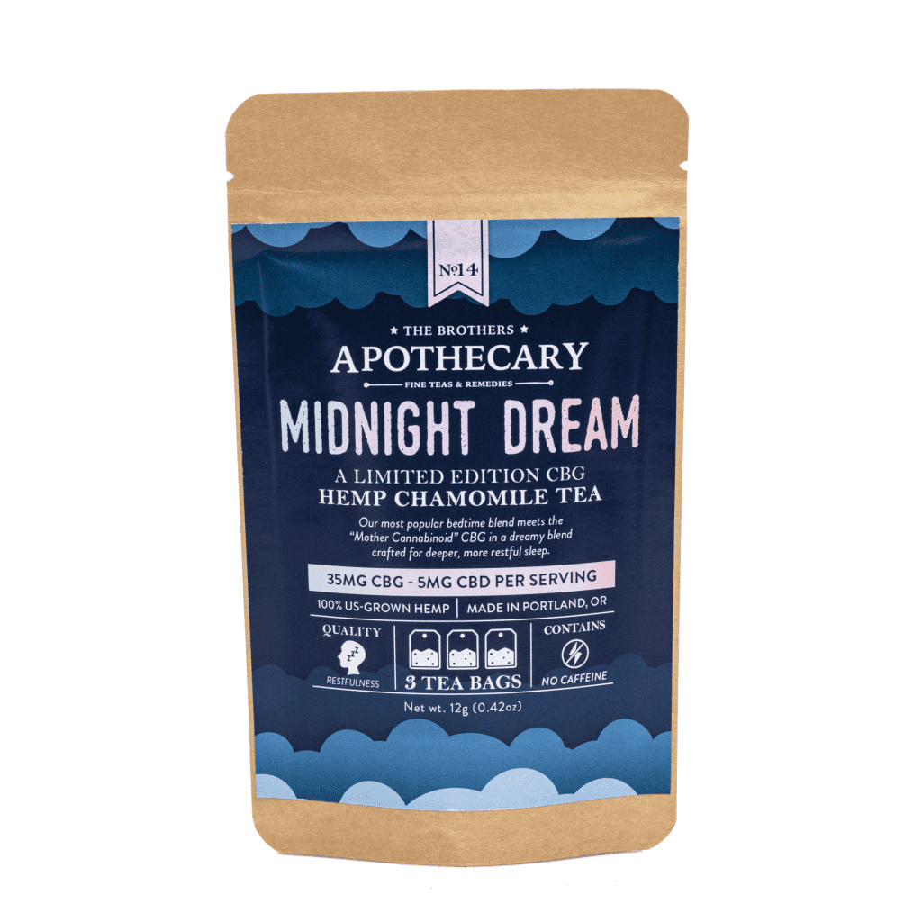 The The Brothers Apothecary Midnight Dream CBG Tea is infused with organic CBG flower, sun-grown in Oregon’s Illinois River Valley. Midnight Dream is a unique take on the popular bedtime tea, Golden Dream. The calming chamomile rocks you to sleep, while the spearmint, orange peel, and lemongrass sing you a lullaby. The CBG completes the package for a deep, restful night’s sleep. Known as the Mother Cannabinoid, CBG is the precursor to many cannabinoids, including CBD. Each package contains: 3 tea bags, 60 mg Full Spectrum CBD per tea bag, no caffeine, coconut milk (used as a lipid to increase CBD absorption). Midnight Dream begins with a delicate top note of floral honey. The middle note is bright and refreshing, with bright citrus from lemongrass and orange peel combining with a bright toned spearmint. The undertones are warm and nutty, with hints of hemp and coconut.