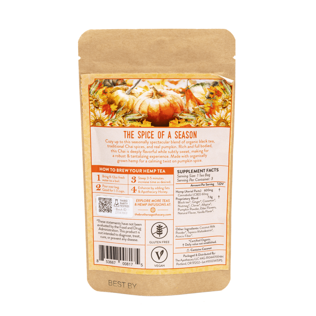 Cozy up to this seasonally spectacular blend of organic black tea, traditional & delicious Chai spices, and real pumpkin & natural flavor. Rich and full bodied, our Pumpkin Spice Chai is deeply flavorful yet subtly sweet, making for a robust, tantalizing drinking experience reminiscent of fall. Made with locally grown hemp CBD for a calming & invigorating twist on traditional pumpkin spice that pleases the palette. Each package contains: 3 tea bags, 60 MG Full Spectrum CBD per tea bag, caffeine, coconut milk (used as a lipid to increase CBD absorption)