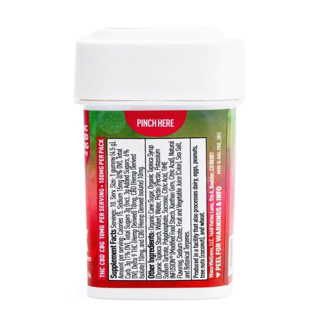 Contains 10 pieces, each containing  10 mg of Hemp-Derived Delta 9 THC, 10 mg of CBD, and 10 mg of CBG.